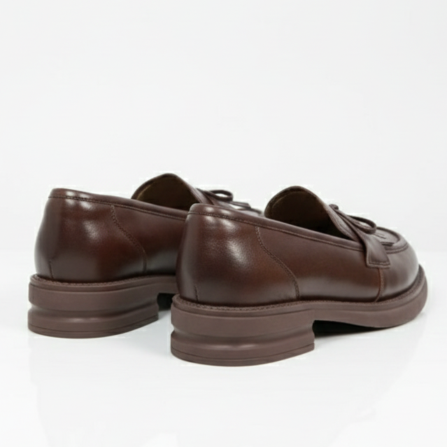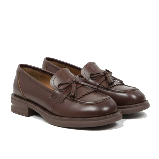 Lune is the perfect embodiment of understated elegance and quiet femininity. Crafted from supple cowhide leather and glossy patent finishes, these loafers feature a refined square-toe silhouette, delicate kiltie fringe, and a hand-tied bow that gently accentuates the grace of every step. The modest 3.5 cm heel subtly elongates the legs while ensuring effortless all-day wear.